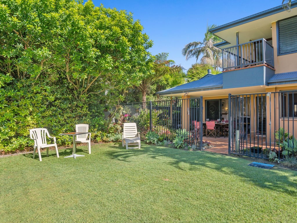 *  Outside, the covered patio has a table setting and BBQ adjacent to a delightful garden which opens to a large back lawn with a secure gate leading down a sandy track to the Belongil beach 1 minute away.