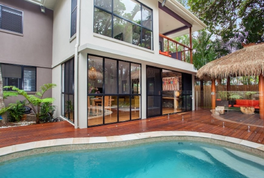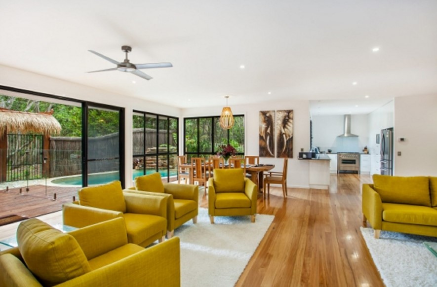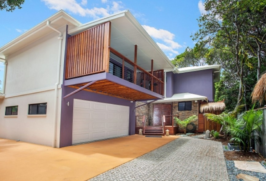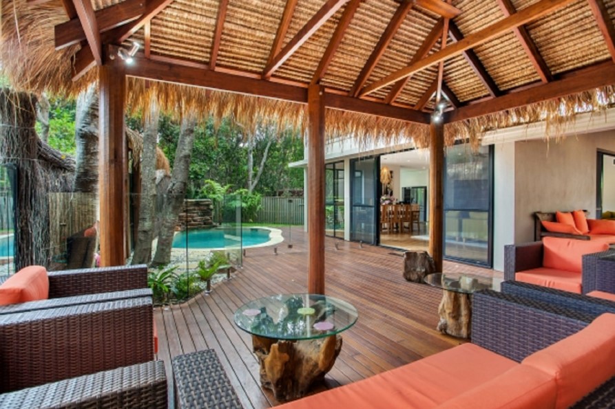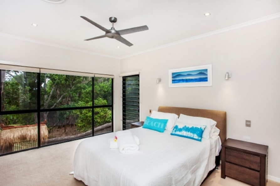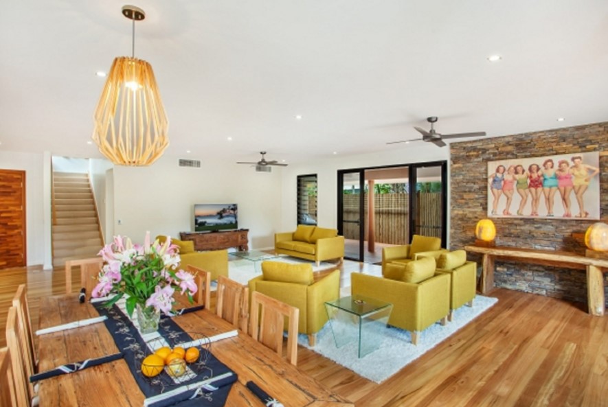 Luxury 4 bedroom 2 bathroom townhouse on the beachfront at Suffolk Park. Relax in the open plan living, dining kitchen area downstairs or by the inground pool with waterfall all surrounded by lush green trees. There is direct beach access from the outdoor entertaining area with comfy chairs and BBQ. A balinese hutt by the pool compliments the outdoor lifestyle that is so an aussie holiday. Upstairs there are 4 large bedrooms the master has an ensuite and private balcony with daybed and views into the tree canopy. There is ducted airconditioning and ceiling fans - the kitchen is well equipped for the chef in the family. Great family holiday accommodation.