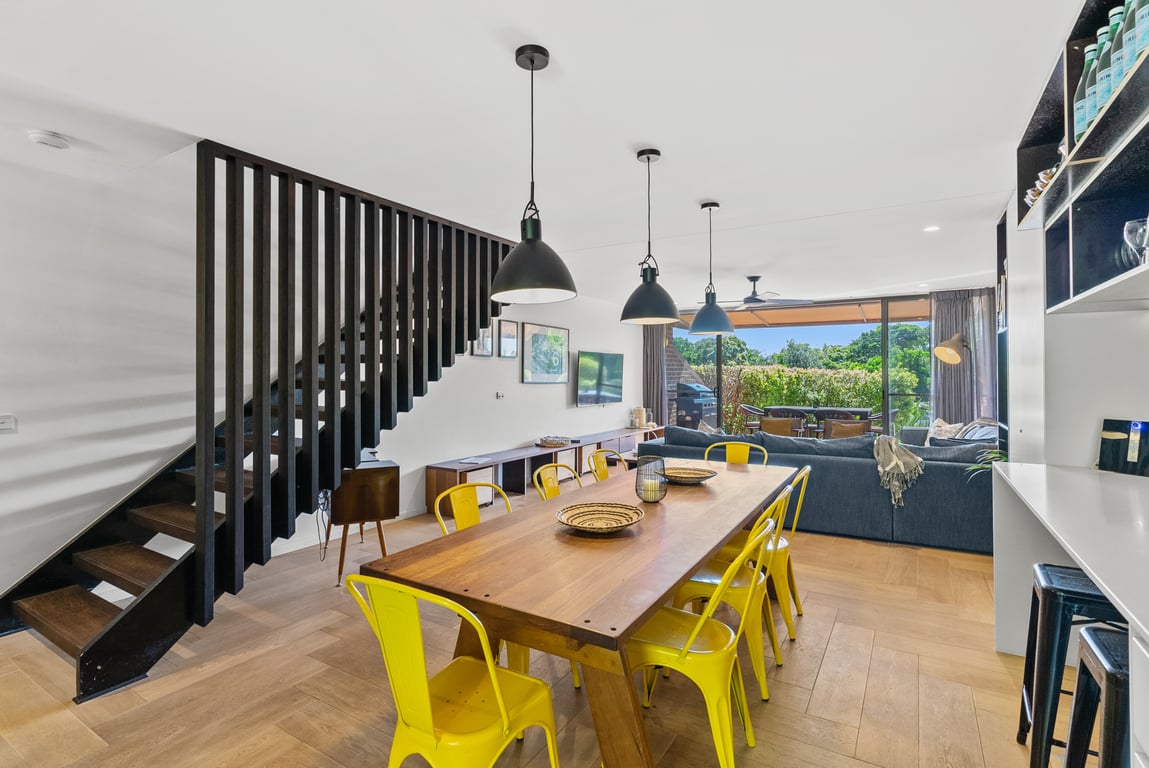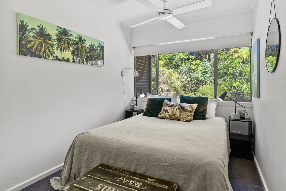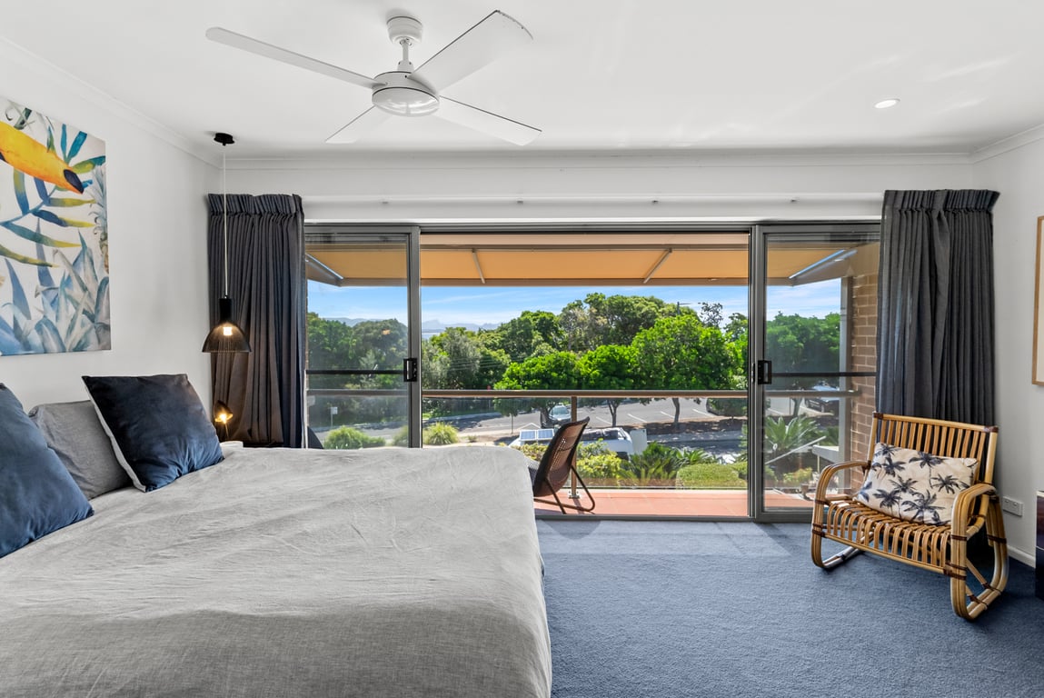 This beautifully renovated two-story, 3-bedroom townhouse comfortably accommodates up to six guests, with two queen beds and two single beds. The master bedroom on the upper level features a private ensuite, balcony, and stunning ocean views up the coast — a peaceful retreat for relaxation. The townhouse is designed for comfort, with cozy living spaces, a fully equipped kitchen, laundry facilities, and secure parking. Guests also have access to the shared slate-tiled pool within the complex.